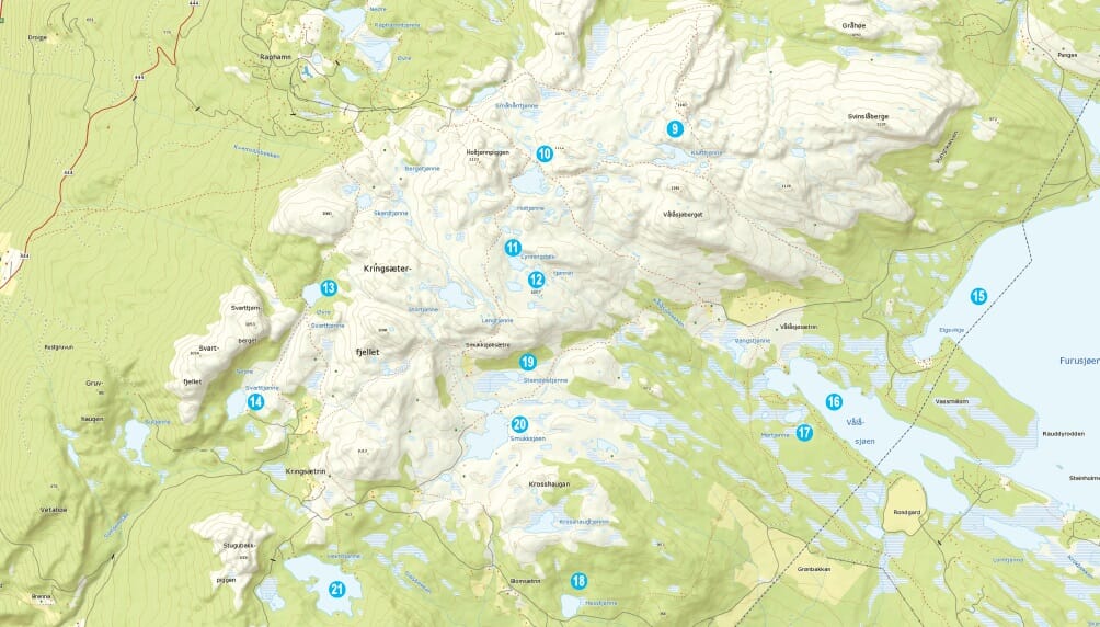 Øvre Svarttjern ligger på Kringsetra, avkjøring like sør for Veistasjonen/Solhjem, ca 3,5 km, skiltet Solhjemslivegen. Bomvei. Husk kontanter.