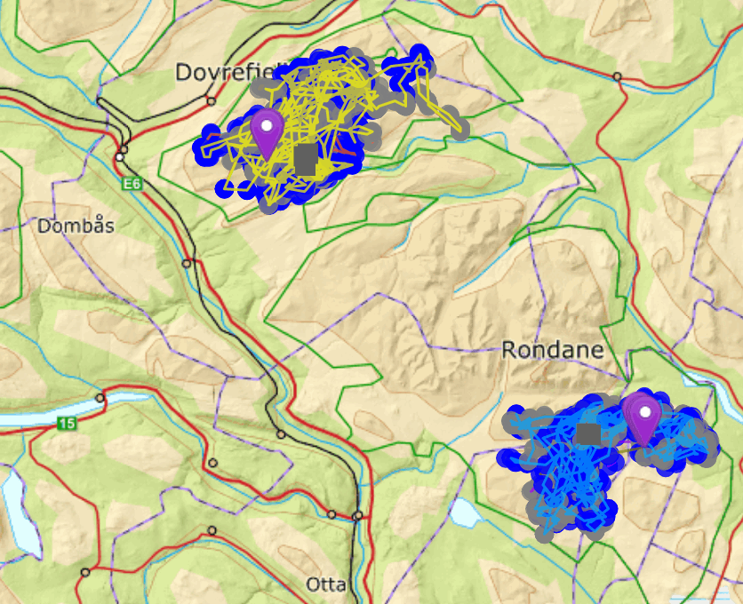 Kartet over viser villreinens arealbruk denne sommeren. Frem til for ca en uke siden. Men situasjonen er ikke endret pr 06.08. Den sørlige stammen er sør for Ula (Vulufjell), og den nordlige er den som nå er innestengt nord for Grimsdalsveien, nord for Ula.