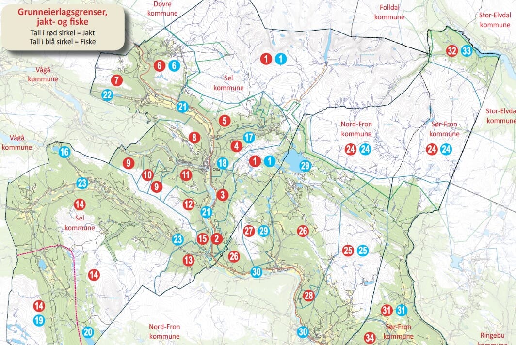 Jakt og fiskekart Kartet inneholder informasjon om jakt- og fiskemulighetene i disse områdene, samt grenser for de ulike grunneierlag, statsallmenninger osv. Kartet koster kr 150,- + frakt. Kjøpes her.